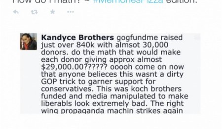 In the latest installment of the blind hatred of Christianity, a liberal activist claims that those 30,000 individuals who donated to the Memories Pizzeria are all tools of Koch Bros, who donated $29,000 each.  I realize I’m just a backwoods construction guy, but I multiplied 29 and 3 added the zeros and it came out $870,000,000, which is pretty good take for pizzeria.  Then I doubled checked it on a calculator to make sure, yep, that’s six zeroes after you multiply 29 and 3.  Just to be sure, I divided $842,000 by 30,000 and I came out with $28, give or take few cents, per those rich 30,000 rich Koch Bros tools.  I think my calculator must be in league with the Koch Bros.
